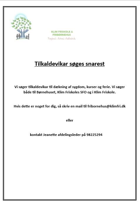 Dette indlæg er hentet automatisk fra Klim Fribørnehus facebookside Vi søger tilkaldevikar Klim Fribørnehus